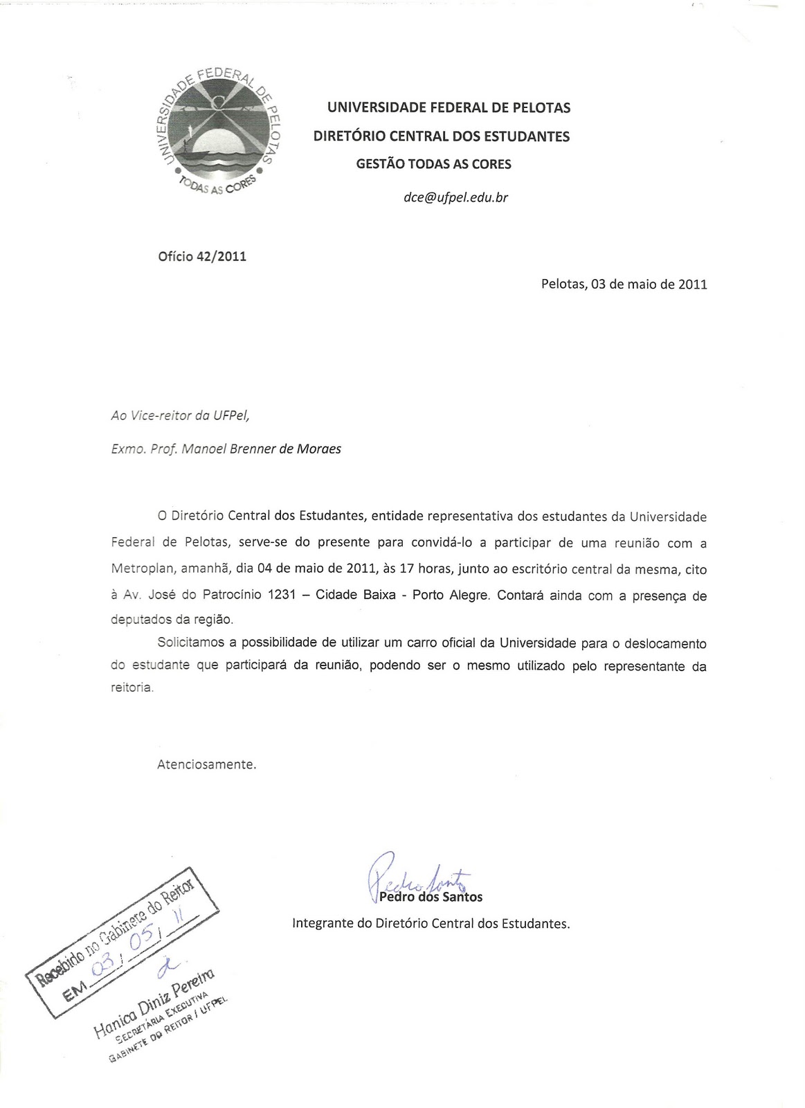 Hoje, Beto visitou a UFPel e após a palestra recebeu o DCE UFPel Gestão TODAS AS CORES, onde recebeu nossas pautas (veja a assinatura acima no ofício), o mesmo ofício entregue em maio à Metroplan e ao deputado Lindenmeyer.